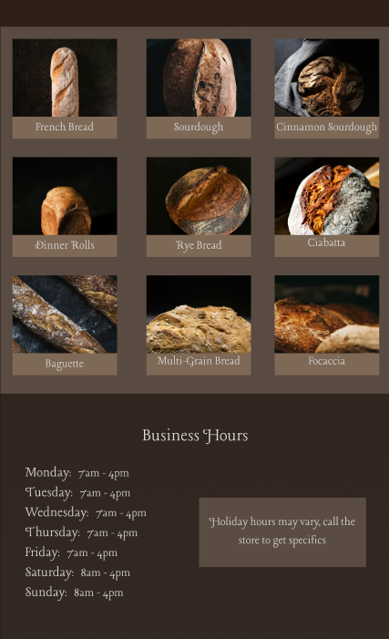 This project began after I saw a cool bakery website on Pinterest. I liked the browns and overall aesthetic so I decided to make my own bakery website. I wanted it to feel professinal and modern, but also have a cozy, neighborhood vibe to it. My first step was to search the internet and resources around me for some inspiration for a mood board. I begin all my design projects with a mood board because it helps me naroow down the base colors, feel, and structure of the design. Onve I had some ideas I created the low level wireframe in Figma and then moved on to the high level prototypes. This was my first time creating components in Figma and making a fully functional prototype.